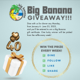 | SPECIAL GIVEAWAY Monday 6th January 2025 Simply purchase dinner and get entered into our weekly raffle for a chance to win a Big Banana gift certificate! Read More