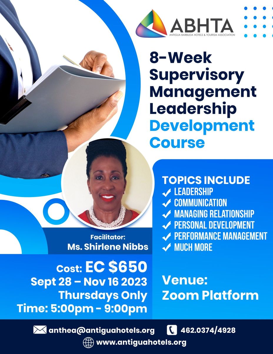 This Supervisory Management Leadership Development Course will be facilitated by Ms Shirlene Nibbs, with over 30 years of experience in tourism and training employees in the hospitality/ business sector. Classes will be conducted virtual, via Zoom Platform, Only on Thursdays (5:00pm – 9:00pm).