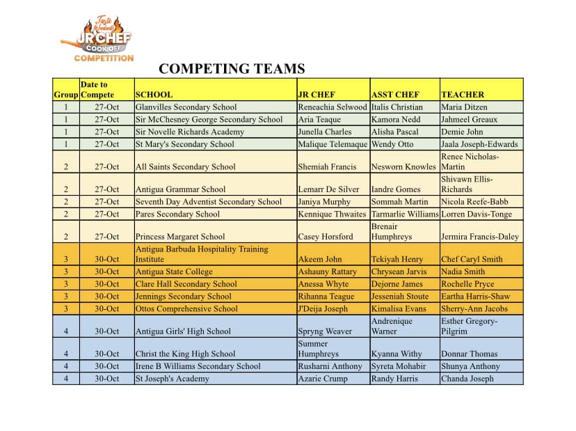 The competing schools will be preparing our very own local dish, The Antiguan Pepperpot to be presented in fine style fit for the global stage. The preliminary competitions are scheduled for October 27th and 30th.