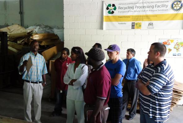 Sustainability and preserving our environment are two keys to the future of tourism in Antigua and Barbuda. On Tuesday afternoon hoteliers showed their support for ABWREC, the recycling plant run by the Rotary Club of Antigua Sundown at Powell’s Estate. During a guided tour of the facility the hoteliers learnt of the different types of material currently processed and were given demonstrations of the grinding of plastic bottles and crushing of aluminum cans.