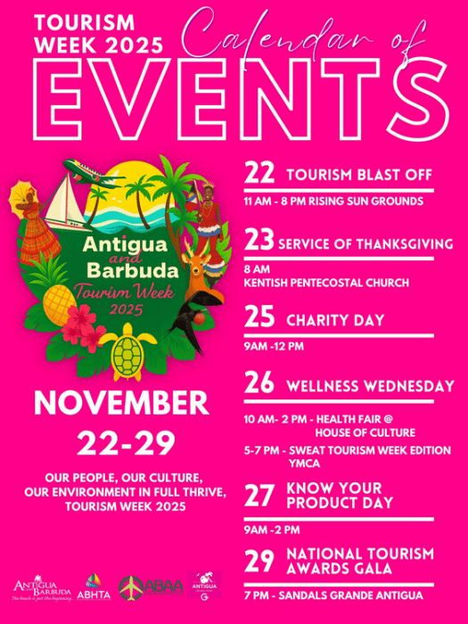 The week will culminate in grand style on Saturday, November 29, with the prestigious National Tourism Awards Gala held in conjunction with the Antigua Hotels and Tourist Association at the Sandals Grande Antigua, where outstanding individuals and organizations will be recognized for their dedication and contribution to the continued growth and excellence of the nation’s tourism industry.
