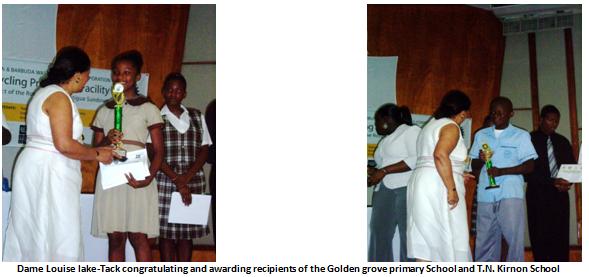 Prizes and awards were given to the recipients by the Governor General Dame Louise Lake-Tack and ABWREC’s Chairman, Mr. Mario Bento. Each school were rewarded certificates of participation while awards given to the six victorious schools were certificates of accomplishment, monetary prizes of EC$1,000.00, $750.00 and $500.00 respectively for each positions in both levels along with trophies.