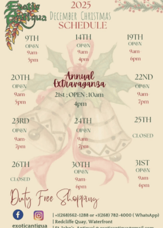 Get ready for the festive season with Exotic Antigua’s 2025 December Christmas Schedule! From extended shopping hours to our Annual Extravaganza on December 21st, we’re making holiday gifting easier than ever. Browse duty-free treasures, find the perfect island-inspired presents, and enjoy convenient opening times throughout the month — including late shopping days and special weekend hours.