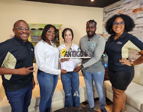 SLC hand over a cheque to the NSA during an ABS interview. From left to right: ABS Host Steve ‘Ibis’ Freeland, Carime, Skye, NSA Instructor Kayon Guiste, ABS Co-Host Patrice Martin.