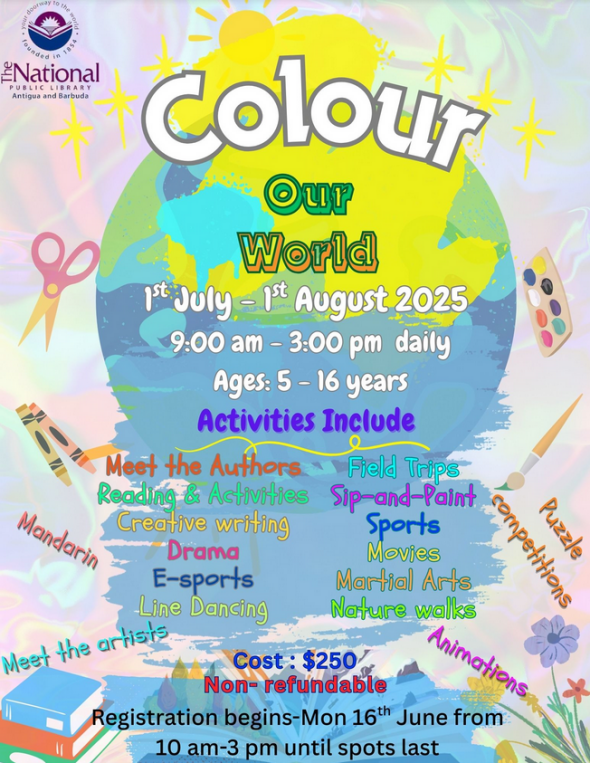 The National Public Library of Antigua and Barbuda is set to brighten young minds with its exciting “Colour Our World” Summer Programme, running from 1st July to 1st August 2025, daily from 9:00 AM to 3:00 PM.