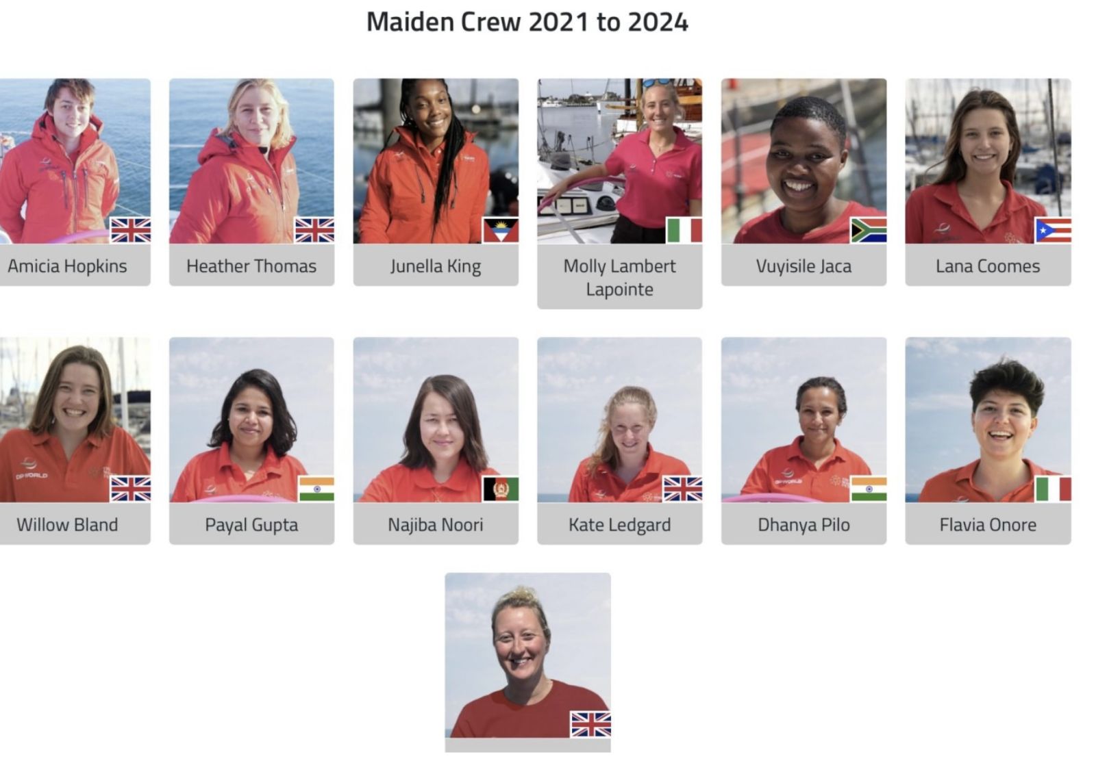 Heather Thomas, UK, 26, Skipper Rachel Burgess, UK, 36, First Mate Willow Bland, UK, 25, Crew Lana Coomes, Puerto Rico/USA, 18, Crew Payal Gupta, India, 33, Crew Ami Hopkins, UK, 30, Engineer Vuyisile Jaca, South Africa, 25, Crew Junella King, Antigua, 22, Crew Molly Lambert Lapointe, Italy/USA, 28, Rigger Kate Ledgard, UK, 26, Crew Najiba Noori, Afghanistan, 28, Onboard Media Flavia Onore, Italy, 22, Crew Dhanya Pilo, India, 42, Crew