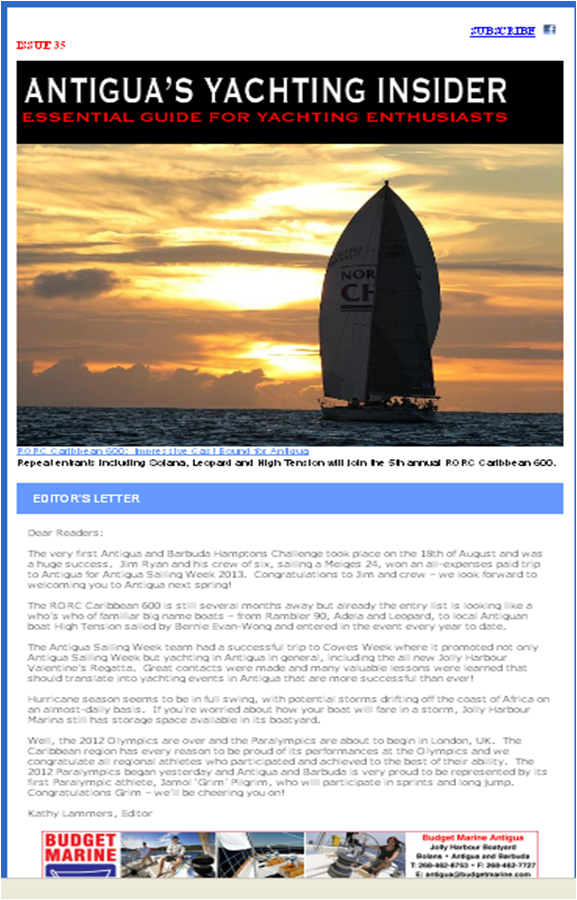 Antigua Yachting Insider is published bi-weekly with the support of its sponsors, providing a digest of major yachting and sailing news, featured articles, press releases and results along with upcoming events. (Previous newsletters are in Archives) Click here for all News and Specials for AntiguaNice Yachting Insider Newsletter