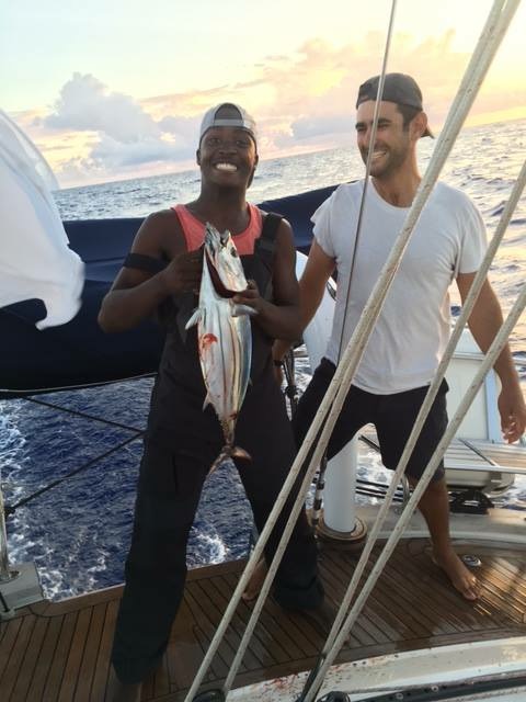 Along the way himself and Captain Andrew along with the other three crew are catching their food as they go, above with a just caught tuna for dinner. He is now in the Azores resting and touring before continuing on in the next leg of the journey.